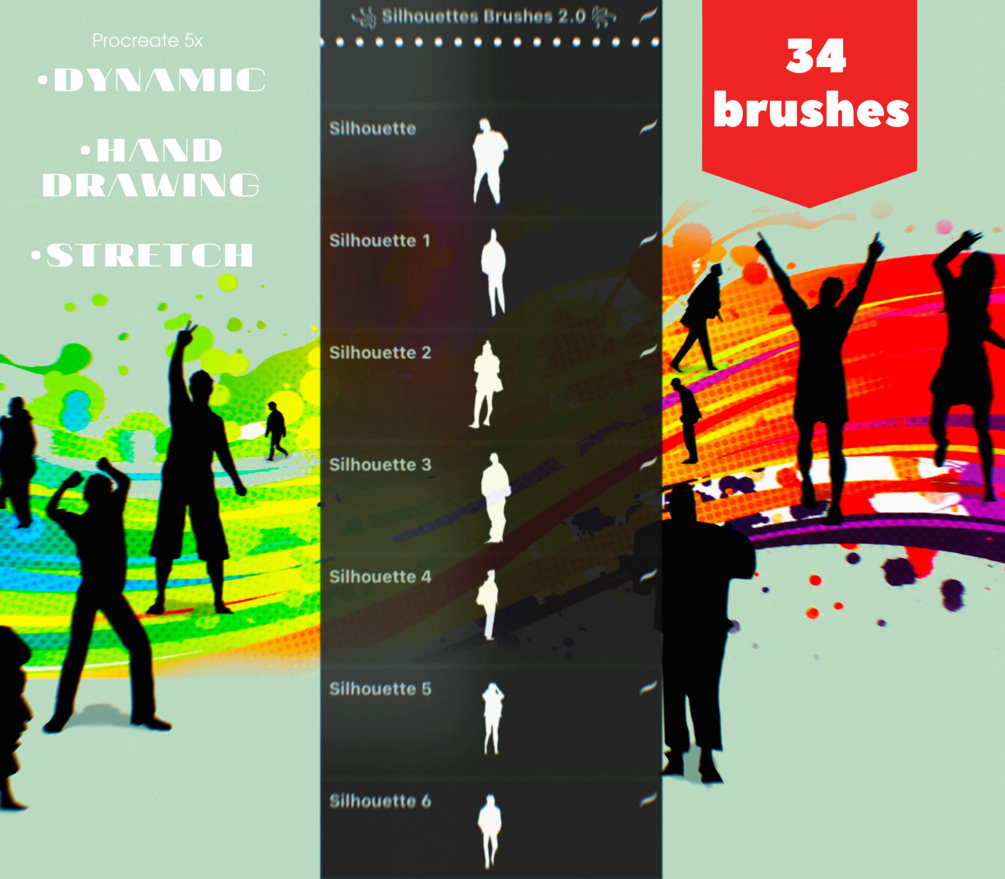 34 brushes for procreate. Silhouettes are dynamic, hand drawing and stretchÂ