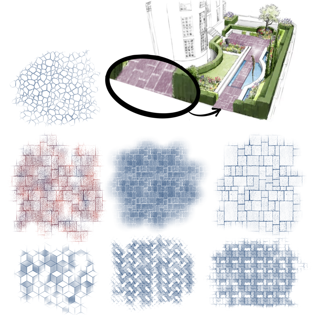 • 32 stamps (15 bushes, 7 cars, 3 figures of people on top, this is all for drawing a landscape plan; as well as 3 bushes and 5 trees for a sketch)